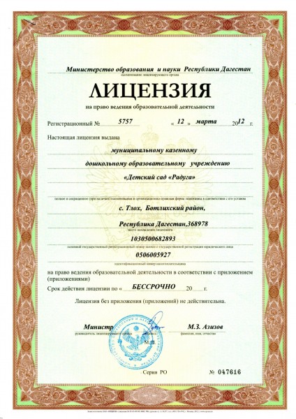 | Полное наименование образовательной организации* | Муниципальное казенное дошкольное образовательное учреждение "Детский сад "Радуга" с.Тлох муниципального района "Ботлихский район" |